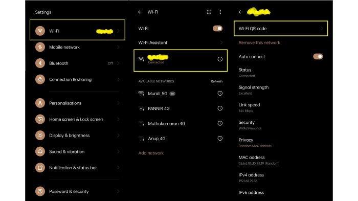 Di dalam halaman detail jaringan, pilih opsi “WiFi QR Code”. Fitur ini berfungsi untuk menampilkan kode QR yang berisi informasi lengkap jaringan, termasuk kata sandi WiFi yang tersimpan di perangkat. -